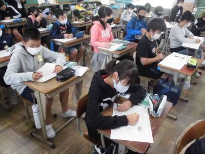 算数の時間には,「比とその利用」について学習したことを確かめるプリントに取り組みました。比をわり算の式にしてから分数で表す方法も思い出しながら問題を解いていました。