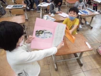 国語で「うみのかくれんぼ」を学習し,自分達でも生き物のかくれんぼカードを造っています。今日は,色画用紙に写真や文章を貼って完成させました。出来上がったカードを見せてくれ,コバンザメや雷鳥がどのようにして隠れるのか教えてくれました。