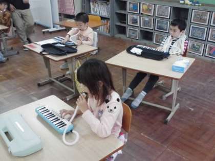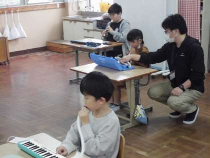 音楽の時間には,「かえるのうた」を鍵盤ハーモニカとリコーダーで演奏しました。みんなで演奏するためには,タイミングを合わせる必要があります。先生の合図で演奏を始めるようにしていました。