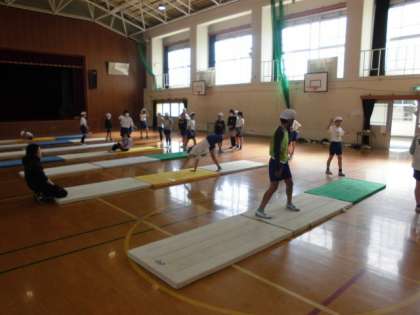 今日は自分のできる技に挑戦しました。体をマットにならした後,前転や後転などに挑戦しました。側転も足を伸ばしてきれいな姿勢で回ろうとしている子もいて,出来栄えも気にしながら取り組んでいる様子が伺えました。