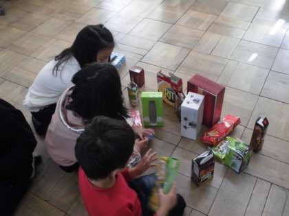 筒,カップ,箱,トレーを使って楽しく遊びました。積み上げて倒してみたり重ねてみたりしました。捨ててしまうものでもあれこれ工夫すると,楽しく遊べることが分かりました。