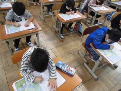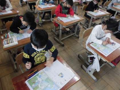 今日は「見る」「見つける」という字を学習しました。目という漢字の下に足が生えたような字です。目の部分の書き順を確かめながら丁寧に書いていました。