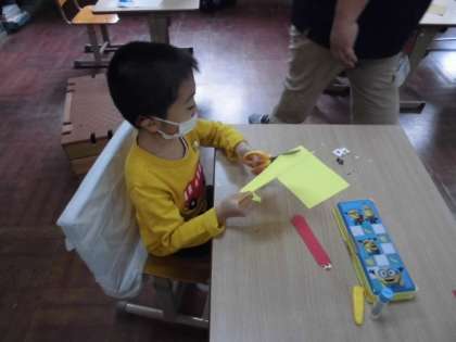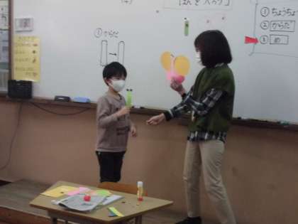 図工の時間には,版画で使うちょうちょを画用紙で作りました。まずは,頭と胸と腹の部分を作ってから大きな羽をつけました。上手に紙を回しながらはさみで丸く切っていました。
