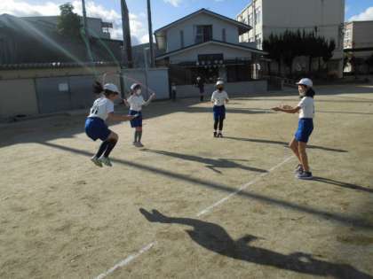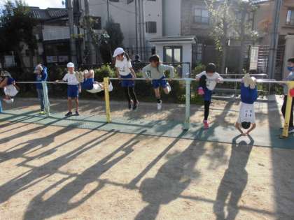 体育の時間には,鉄棒や縄跳びに挑戦しました。これまでの練習を通して,逆上がりができるか確かめたり技を組み合わせたりしていました。縄跳びでは,2重跳びに挑戦している子もいました。