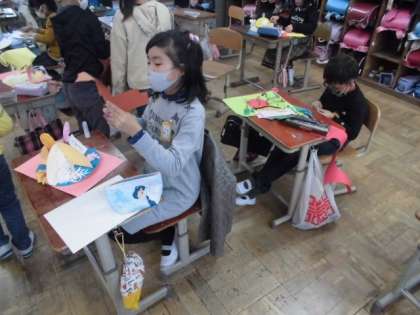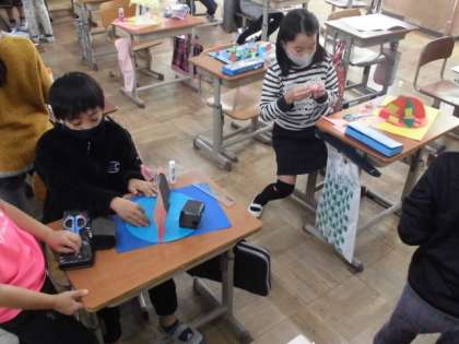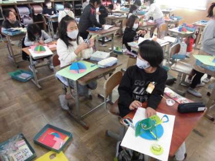自分のイメージができた人からくるくる回る仕組みを生かして楽しい世界を作っています。家から持ってきた材料も使いながら集中して作っていました。池の表面にキラキラ光る色紙を貼ったり4つに区切って四季を表したりしていました。出来上がりが楽しみです。
