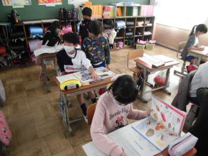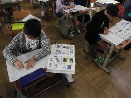 大豆が豆腐や油揚げなどにかわるような食べ物の秘密をみんなに知らせるために資料からたくさんのことを調べています。今日は,中心となる部分をどのように書けばより伝わるか考えました。