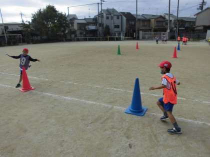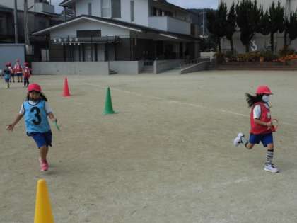 同じグループの人が分かるように同じ色のビブスを着て準備完了。今日は,グループ対抗の折り返しリレーをしました。バトンをもって走り,素早くカラーコーンを回って帰ってきます。グループの人のために一生懸命走る姿が見られました。
