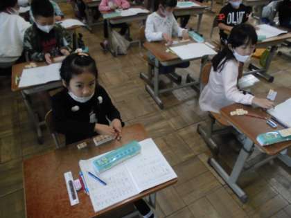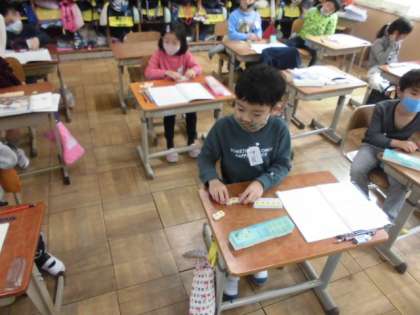 12−7をどうやって計算すればいいか数図ブロックを使って考えました。2−7はできないので,10を借りてきて引くようにしました。10−7をして残った3を2にたして,答えは5と求めていました。いくつかの操作は必要ですが,慣れてくると早くできるようになっていくので,今は丁寧に計算するようにしてほしいです。