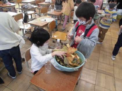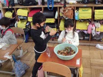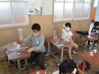 2つの容器を組み合わせて,マラカスのように組み立てることにしました。しかし,テープを貼ってつなげるのに苦労していました。