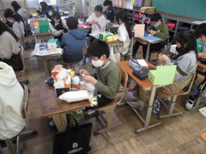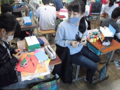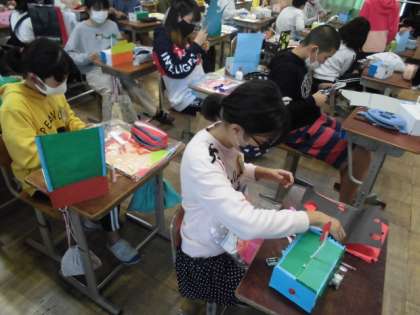 くるくる回るクランクの仕組みを生かした工作をしています。人がジャンプする様子や何かが飛んでいる様子などいろんな場面を想定して作っています。細かい作業も集中して丁寧に取り組んでいるので,出来上がりがとても楽しみです。