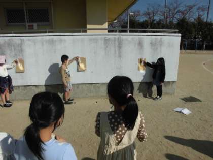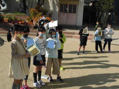 最近,秋なのにずいぶん暖かい日が続いています。今日も雨も降らないので,太陽の光の学習ができました。太陽の光があたると暖かいので,鏡を使ってその光を集め,温度の変化を調べました。鏡が1枚の時よりも2枚,3枚と増やして光を集めた時の方が,温かくなることが分かりました。