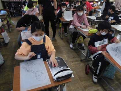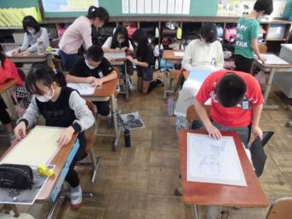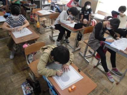 今回の版画のテーマは「リコーダーを吹く自分」です。鉛筆で描いた下絵をペンで太く縁取ってからうつし紙で写し取ります。それをカーボン紙を使って板に描いていきます。1つ1つの線を丁寧に描いていました。
