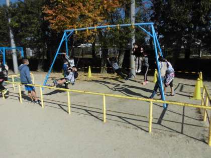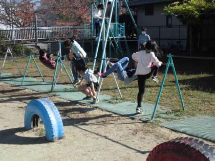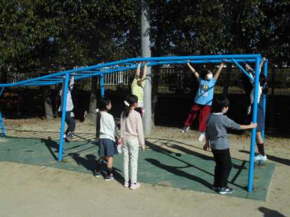 最近,晴れの日が多く,外で元気に遊べる日がたくさんあって,子ども達も大喜びです。みんなで走ったり遊具で遊んだりしています。体育の時間に鉄棒や縄跳びの学習をしたのか,休み時間に友達と練習している姿も見られました。