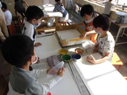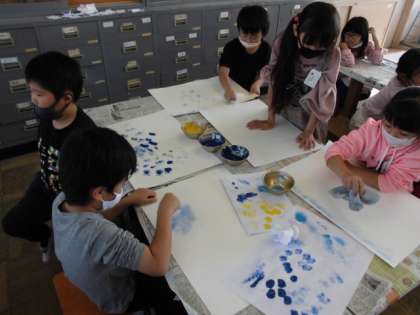いろんなものを使ってスタンプすると,どんな形ができるのか考えながら絵を描きます。その前にまず,背景にローラーやビー玉などを使って,模様をつけていきました。絵の具をつけたビー玉が転がると自由な線を残してくれるので,喜んで活動していました。
