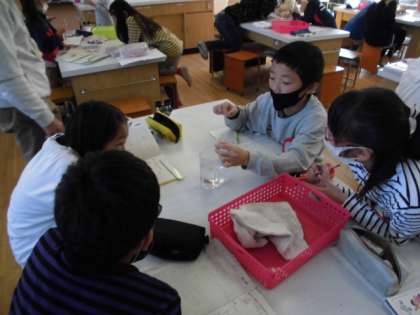 ふたをしたペットボトルが膨らむのは,容器の中の空気の体積が大きくなるのではないかと考えました。そこで,試験管の先を液体でふさぎ,空気を閉じ込めた状態でお湯の中に入れてみました。すると,試験管の先にある膜がシャボン玉のように膨らみました。