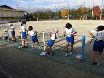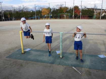 鉄棒からおなかを離さないように両腕でぐっと体をひきつけて,逆上がりに挑戦していました。地面を蹴るタイミングを試しながら,少しずつ体が上がってきました。1度できれば,タイミングをつかんでいるので,繰り返しできていました。