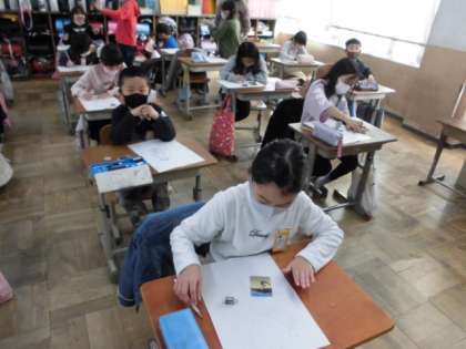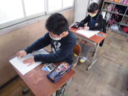 図工では,版画に取り組んでいます。テーマは「自分が遊んでいる姿」です。まずは,一輪車やうんてい,竹馬などいろんな遊びをしている様子を絵に表すところから始めます。ひじや膝が曲がっているところをどのように描けばいいか迷っていました。