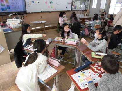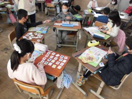 英語では三角形を「triangle」と言い,ひし形は「diamond」と言います。色も紫を「purple」と言い, 赤を「red」と言います。今日は,グループ内で順番に欲しい色と形の書かれたカードをおねだりするゲームをしながら,いろんな言い方に慣れ親しんでいました。