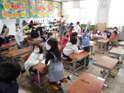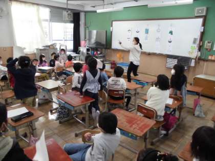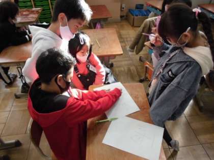 自然にあるものの形からできた漢字や記号からできた漢字など,漢字によって成り立ちは違います。今日は,これまでに習った漢字の成り立ちについてクイズをしました。グループで相談しながら答えを導き出し,正解すると喜んでいました。