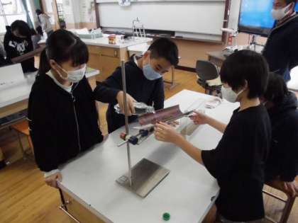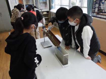 土地の断面に見られるしま模様のことを「地層」ということを学習しました。実際,地層はどのようにしてできるのか考えてみると,火山の噴火や川の流れが関係しているのではないかと予想を立てました。今日は,模型を使って川の流れを再現し,削られた土がどのようにして積もっていくのか観察しました。