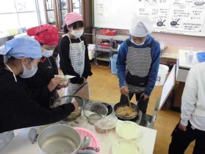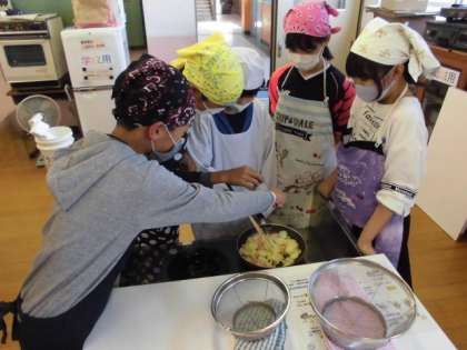 じゃがいもやコーンを使ってジャーマンポテトを作りました。材料を順番に入れて炒めますが,先に入れるものと後から入れるものがあります。タイミングに気を付けるとともにほどよい味付けができるように協力して調理していました。