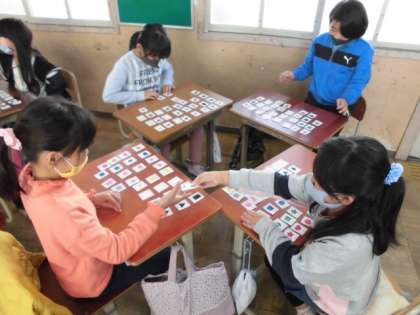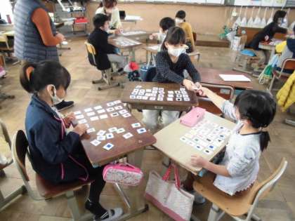 「ピンク色の四角形」や「紫色の星形」などいろんな色の図形があります。自分が欲しいカードを順番にお友達に伝えていくゲームをしました。うまく「yellow circle please」などと言ってカードを受け取っていました。