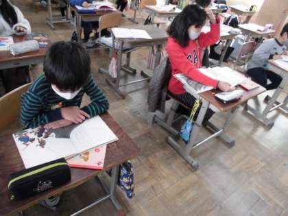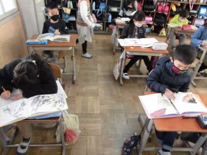 「三年とうげ」というお話を読んで,どんな出来事があり,どのように解決したのかなどを読み取りました。その学習を生かして,今度は図書館で自分の選んだ絵本を読み,紹介することになりました。まずは,どんなお話なのかじっくり読んでいました。