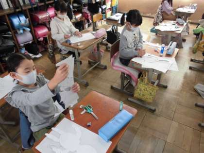 今日は,自分の体のパーツを画用紙に描いて切り取りました。その後,切り取ったパーツを貼り合わせて,一輪車に乗っている自分や竹馬をしている自分を表現するのですが,貼り合わせる時には,画用紙の大きさや向きがとても大事になってきます。