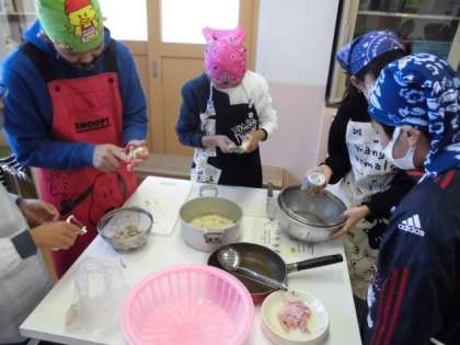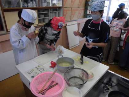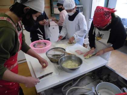 今日は2組が調理実習でじゃがいもやコーンを使ったジャーマンポテトを作りました。身支度をした後,じゃがいもの皮をむいてから包丁で輪切りにしました。あまり使い慣れていない調理器具でしたが,慎重に使うことで上手にできていました。