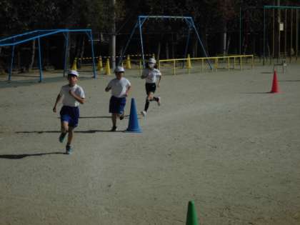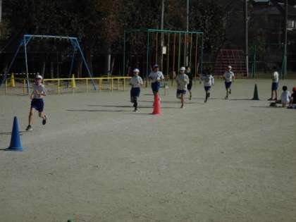 5年生はジョギングに取り組みました。長い距離を走り切れる自分のペースを探るので,どのくらいのペースが自分に合っているのか考えながら走っていました。