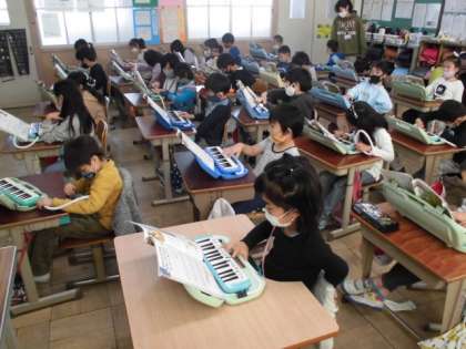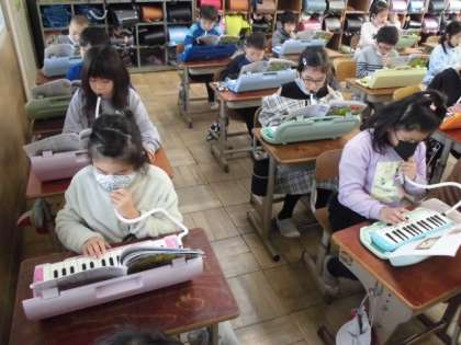 「こぎつね コンコン やまのなか〜」と歌詞に出てくる場面を思い浮かべながら,鍵盤ハーモニカで演奏しました。慣れてくると速くなってしまいがちですが,みんなと合わせるように気を付けていました。