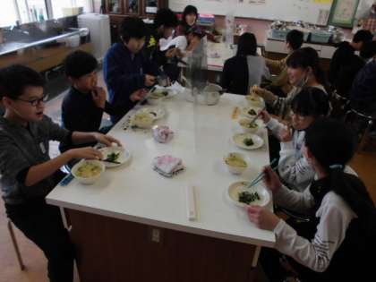 調理実習でみそ汁とほうれん草のおひたしを作りました。みそ汁は,煮干しからだしを取りました。具材となる大根やねぎ,油あげを切って入れました。食べてみると,大根も柔らかくて,だしの味がきいたとても美味しいみそ汁ができました。