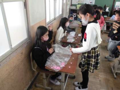 「yellow star」や「red triangle」など英語で形や色の言い方を学習してきました。今日は,お店屋さんとお客さんに分かれて,どんな形が欲しいのかたずねたり,自分の欲しい色を伝えたりしました。星形ばかり集めている人もいれば,いろんな形を集めている人もいました。