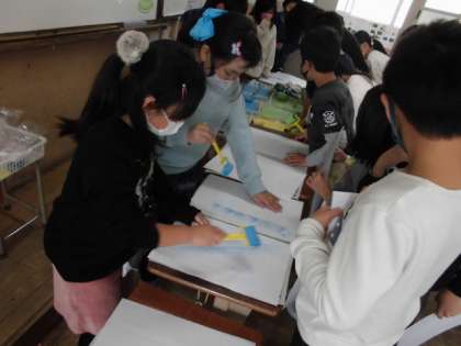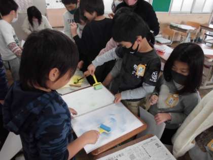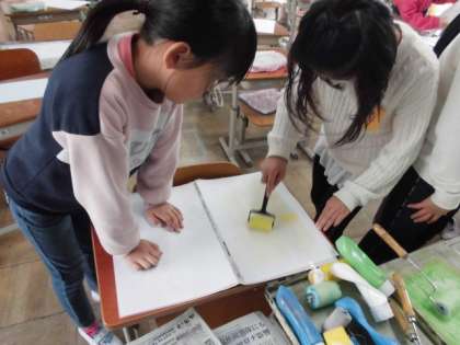 図工の時間には,自分の遊んでいる姿を題材にした紙版画に取り組んでいます。自分の姿ができてきたので,版画を刷るための台紙にローラーで色をつけました。ローラーの通った跡がいい具合に模様となっていました。