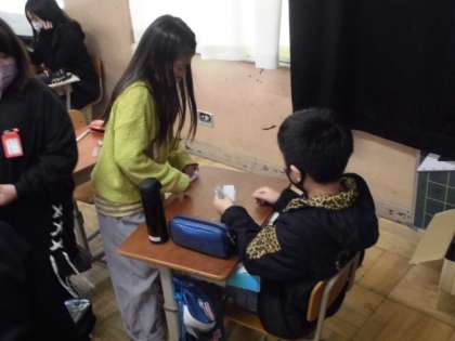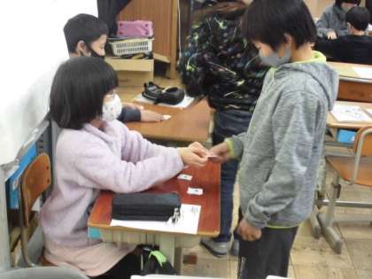 バナナやみかん,いちご,りんご,など自分が欲しいものをもらう時,英語でどう言えばいいか学習しました。いろんな人と何度も同じ表現を使って話すことで,だんだん慣れていました。集めた果物を使ってフルーツパフェでも作ろうかな。