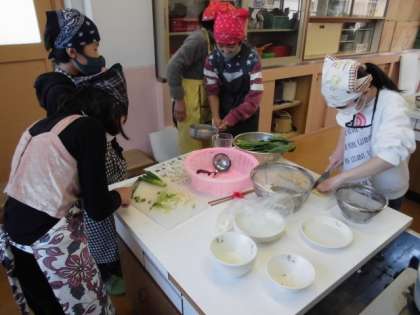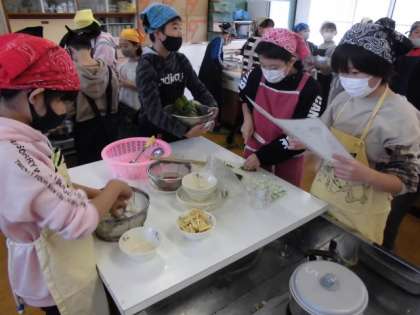 今日は1組が家庭科の時間にみそ汁とほうれん草のおひたしを作りました。みそ汁の具材を切る担当は,切り方を考えて慎重に切っていました。だしをとる係は,お湯を沸かしたり煮干しを用意したりして手順を確認しながら進めていました。