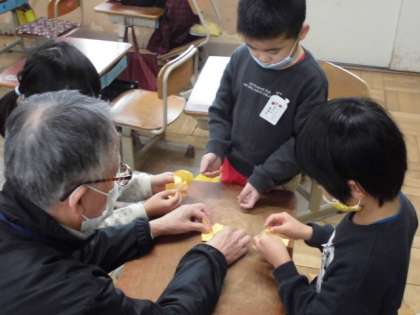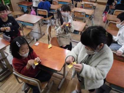 学校で見つけたたくさんのニコニコをカメラに撮るために,折り紙でカメラを作りました。折り方が難しいところは教えあうことでカメラが完成しました。休み時間になると,いろんな場所で見かけたニコニコを撮っていました。