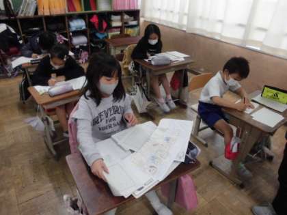 自分でお話を考えて,場面ごとの紙芝居を作りました。お話の展開に合わせてどんな場面を絵にすればいいか考えていました。描きたい場面は決まっているけど構図が決まらなかったりお話の続きをどうするか悩んだりしていました。