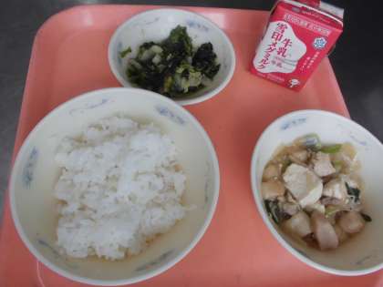 『ほうれん草とはくさいのごま煮』の「はくさい」は,冬に美味しくなる野菜です。白菜のあま味やおいしさを味わって食べました。今日の給食では,けずりぶしでとった出し汁・みりん・醤油で,ほうれん草・はくさいを煮,最後にすりごまを加えて仕上げました。