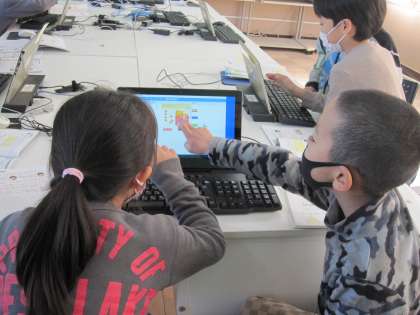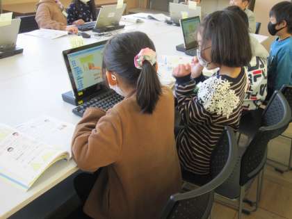 二人組で,辺の位置や長さの関係を確認しながら,プログラミングして作図していきました。コンピュータを活用すれば簡単に図を表したり,やり直したりすることができるので,みんな試行錯誤しながら取り組んでいました。