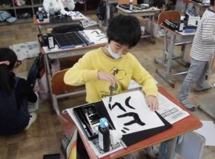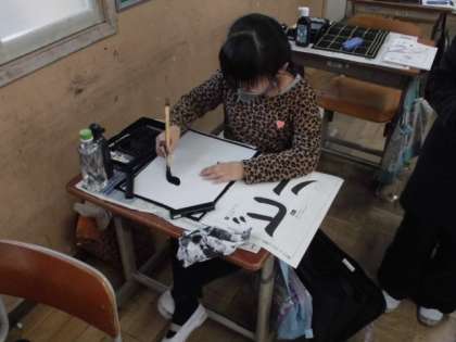 「ビ」の曲がりや「ル」の折れに気を付けて書きました。思った通りに筆を動かすことは難しいですが,ひと筆ずつ集中して書いていました。