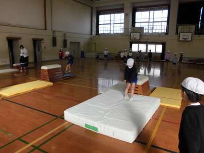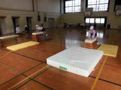 自分が安心してできる場を選んで,開脚跳びなどに挑戦しました。まだ,自信がない時もあるので,ウレタンマットを敷いた場を用意すると,安心して取り組めていました。