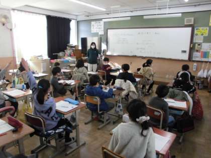 子どもや木が並んでいるとき,条件を満たす人数や距離を求めたりしました。7本の木が2メートル間隔に並んでいる時,端から端まで何メートルになるのか,自分の考えを説明し合って答えを求めていました。
