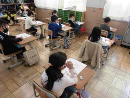 算数の時間には,テストをしました。自分が学習してきたことをもとに問題文を読んで答えを導き出していました。考えやすくするためにテスト中は静かにします。1年生ももうすっかり小学生。静かな雰囲気で集中してすることができました。