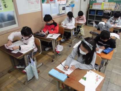いつも元気に遊んだり活動したりしている2年生ですが,今日は,「元気な子」という字をマイネームで書きました。配られた紙に対して,文字の大きさやバランスを考えながら,静かに集中して書いていました。