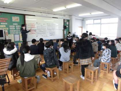 「風を切って」という曲では,合奏に挑戦します。各旋律の特徴をつかんでからどんな楽器で演奏すればいいか考えました。使う楽器が決まると,自分のパートを決めるために話し合いました。