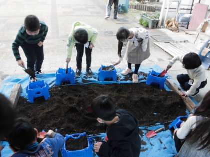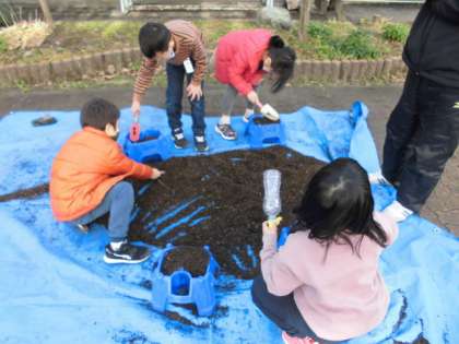 あさがおを植えていた植木鉢を使って,チューリップの球根を植えました。土を入れてから穴をあけ,そこに球根を入れてからそっと土をかぶせます。これからお世話をして,どんな色の花が咲くか楽しみです。