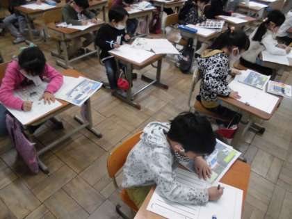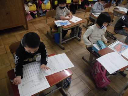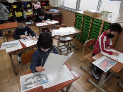 自分の選んだ自動車について調べてきましたが,今日は,画用紙にまとめました。自分の調べている自動車の絵を描き,どんな自動車なのか説明を書いていきました。