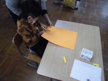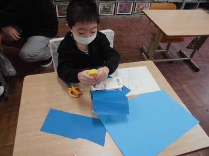 牛乳パックを使って猫やぞうなど動物を作ります。まず,牛乳パックの形を整えて,周りに色画用紙を貼りました。パックの大きさを測ってからはさみで切り,ボンドでつけました。これから顔などを作っていきます。