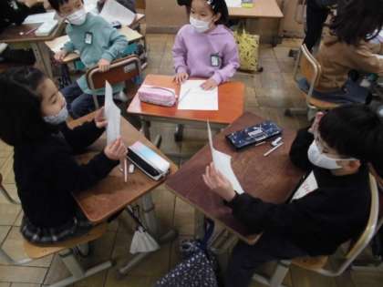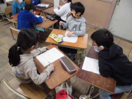 先日,いつもおいしくいただいている給食について,感謝の気持ちを込めた標語をみんなで考えました。今日は,人権標語を考えました。みんなが気持ちよくすごせるために大切なことは何か意見を出し合いました。「けんこう」「なかよく」「ゆずる」「心ひとつ」などいろんな意見が聞かれました。